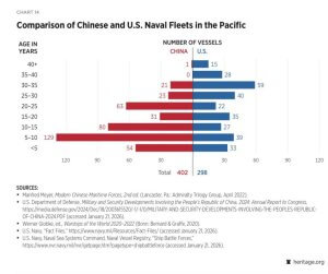 This chart compares the age distribution of Chinese and U.S. naval fleets. China’s fleet contains a larger number of relatively new ships, reflecting rapid shipbuilding expansion in recent years.