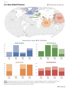 This Heritage Foundation chart illustrates the geographic reach of U.S. naval operations across multiple regions. Carrier Strike Groups and Amphibious Ready Groups are routinely deployed worldwide, highlighting the constant global demand placed on the fleet.