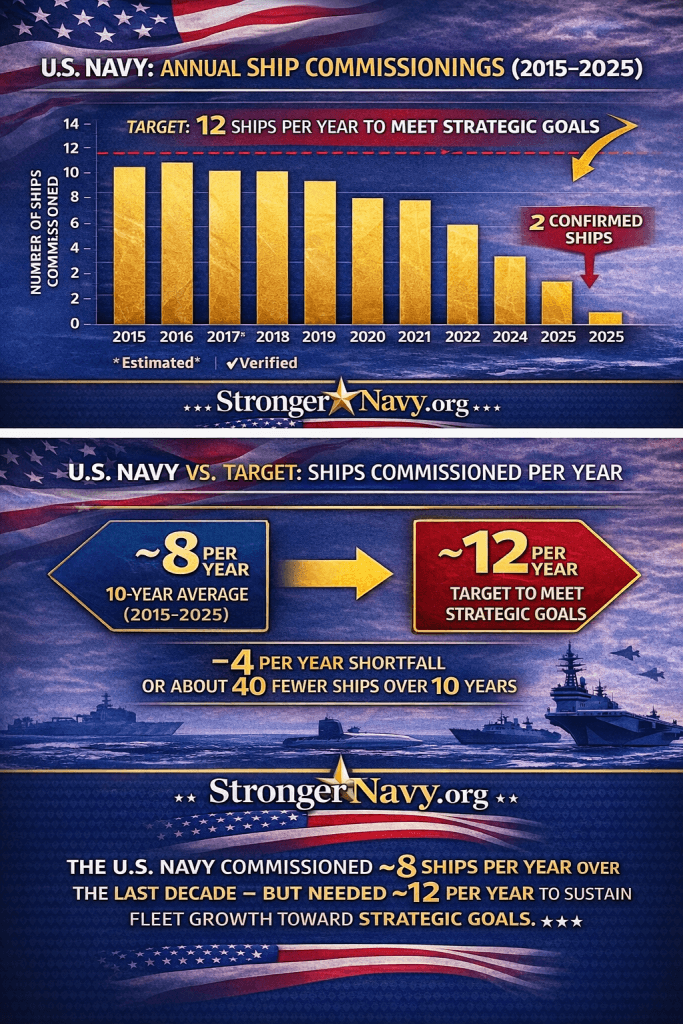 The analysis reveals a stark 10-year trend: from 2015 to 2025, the Navy averaged just 8 ships commissioned per year — falling far short of the 12 ships per year required to meet strategic goals. This represents a shortfall of approximately 40 fewer ships over the decade, occurring precisely as China’s People’s Liberation Army Navy has become the world’s largest naval force.